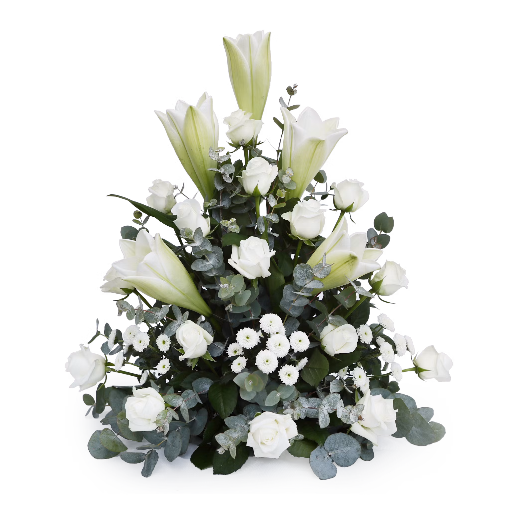 I denna dekoration hittar du vita Rosor, Liljor och Santini samt gröna Eukalyptus blad i en smakfull kombination.