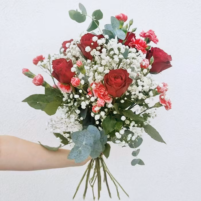 Fröken Färg KÄRLEKSBUKETTEN är en klassisk bukett med Rosor, Nejlikor och Brudslöja och eukalyptus..